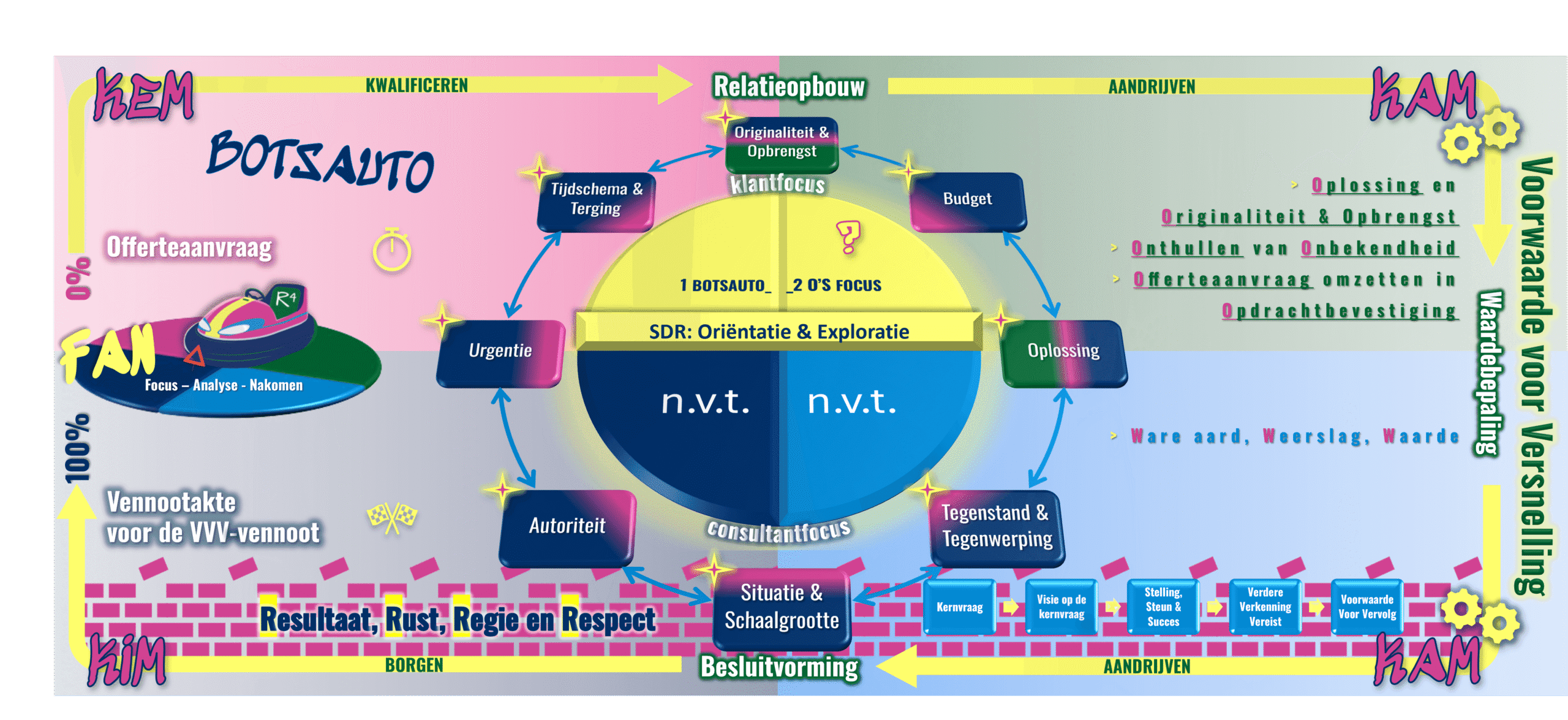 - Vragen stellen en nieuwsgierigheid – De SDR moet in staat zijn om de juiste vragen te stellen om de latente behoefte van de prospect te verkennen. Dit is essentieel voor de eerste stappen van de Verdiepen-fase binnen BOTSAUTO.